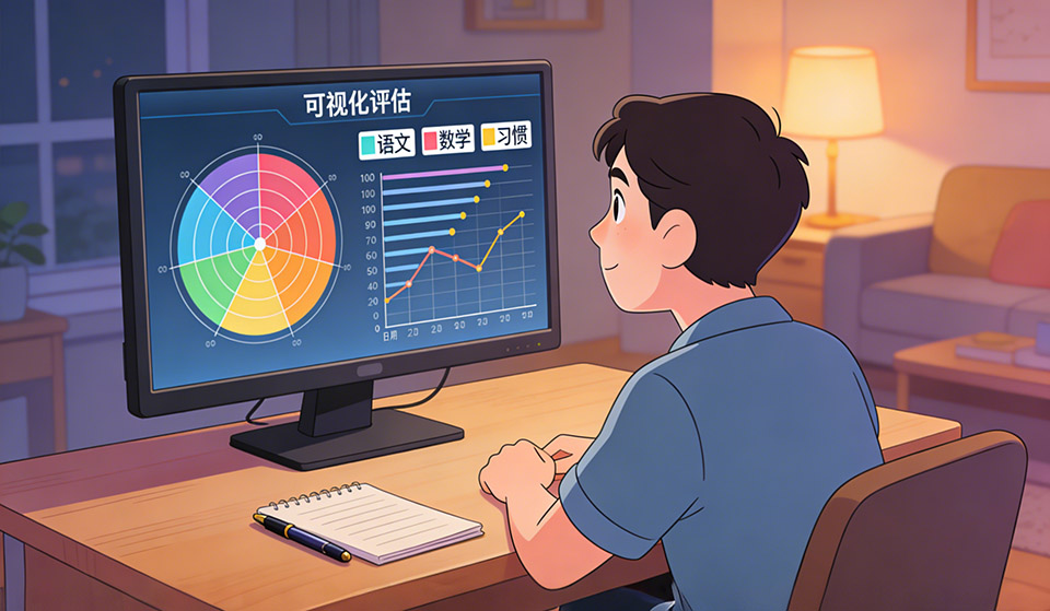 所有评估结果最终都要落在可理解的可视化上。针对孩子端,系统可以用成长树、星级进度条或热力图等形式,展示某一学科或技能在一段时间内的变化趋势,引导孩子关注“自己变得更熟练”而不是单次分数。针对家长端,则可以用雷达图和时间轴结合的方式,同时呈现认知、情绪和习惯三个维度的趋势。