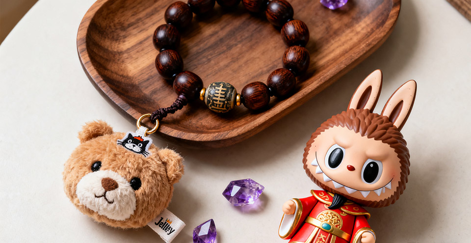 玄学商品不断创新。寺庙手串、能量水晶、祈福挂件等传统商品,和Labubu财神、Jellycat转运符等潮玩结合,形成新的消费热点。品牌通过联名、限量、IP化等方式,提升商品附加值。