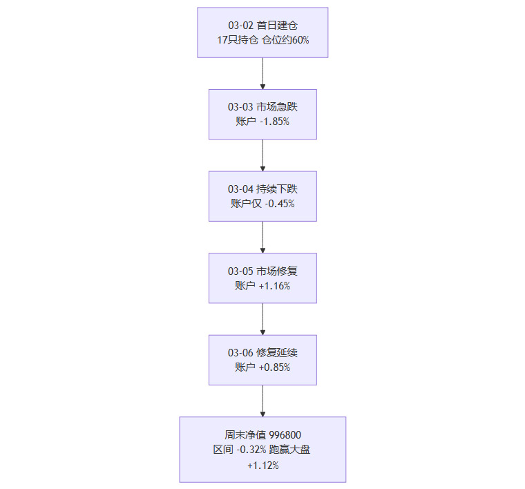 3月4日,市场继续下跌,沪深300跌 1.14%,账户只跌 0.45%,当天跑赢 0.69个百分点。这是首周最重要的一组数据。它说明系统的回撤控制并不是偶然,而是组合设计开始生效。中等仓位、分散持股、保留现金、避免高beta暴露,这些结构在市场第二次下探时开始体现效果。