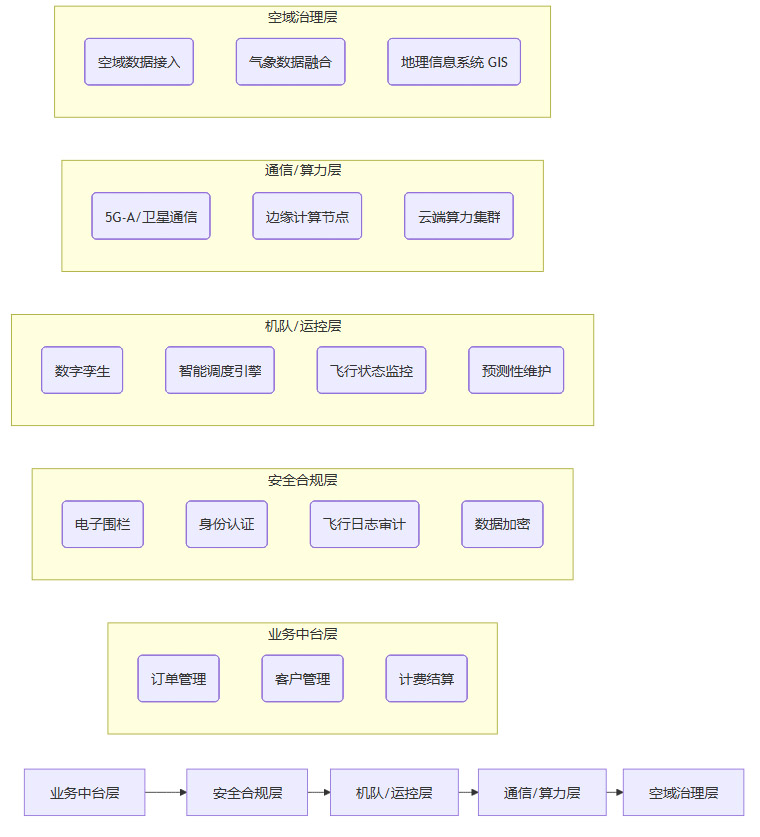 基础设施技术:大规模组网运营离不开底层基础设施的支撑。这包括空域精细化管理技术、高可靠的通信/算力网络、以及新一代的智能运控平台。这些技术共同构成了低空经济的“数字底座”。