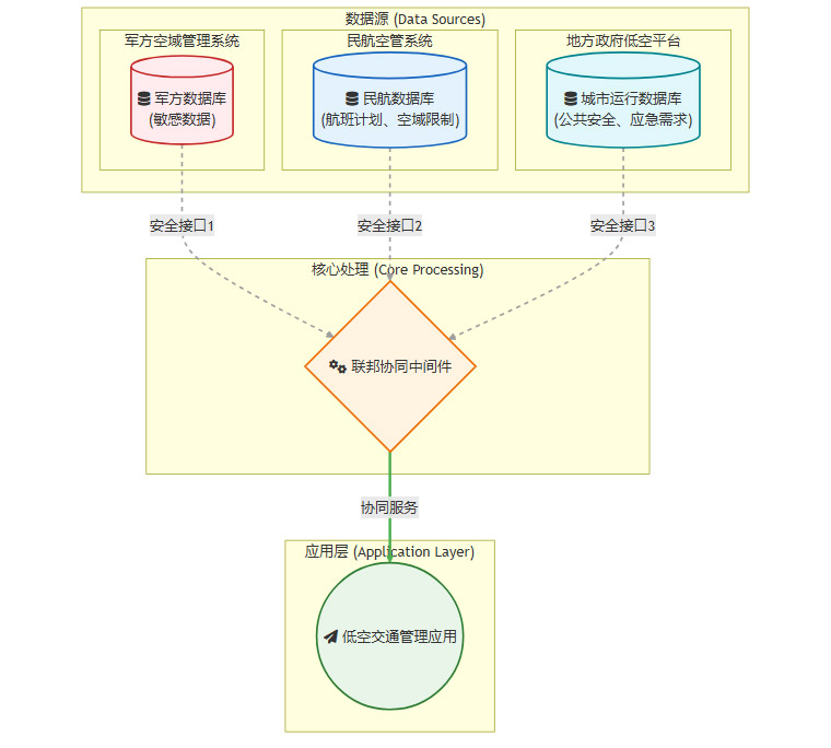 直接将各方数据汇集到一个中央数据库是不可行的。军方、民航的核心数据涉及国家安全和航空安全,具有极高敏感性。地方政府的城市运行数据也同样敏感。数据主权和安全是任何技术方案都必须优先考虑的边界条件。