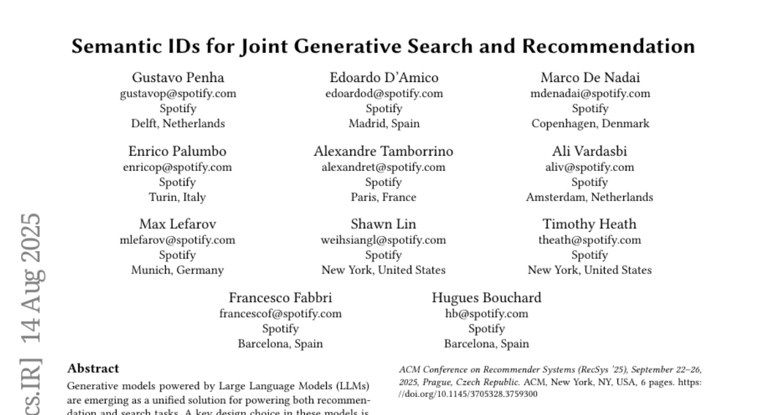 这项令人瞩目的研究,正是由来自Spotify遍布全球的科学家团队共同完成。团队成员包括荷兰代尔夫特的Gustavo Penha、西班牙马德里的Edoardo D'Amico、丹麦哥本哈根的Marco De Nadai等十一位研究者。该研究成果将发表于2025年9月在捷克布拉格举行的第十九届ACM推荐系统会议(RecSys '25)。