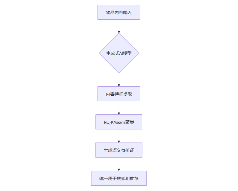 这个流程清晰地展示了从原始的物品内容(如音乐的音频、电影的简介)输入开始,如何通过一系列AI模型和算法,最终生成可供搜索和推荐系统统一使用的“语义身份证”。