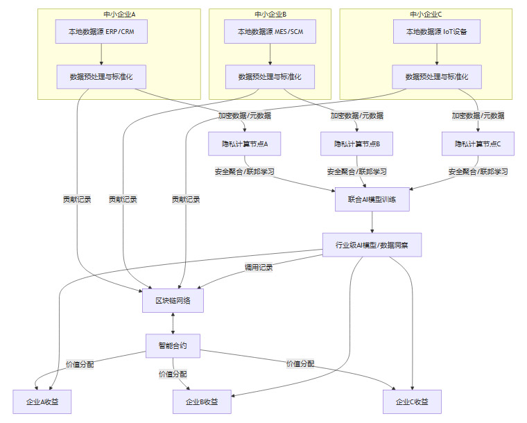 这个流程清晰地展示了,数据在本地经过标准化处理后,通过隐私计算技术在数据空间内进行联合建模。整个过程由区块链记录和智能合约管理,最终产生的价值(AI模型或数据洞察)再反馈给参与的企业,形成一个完整的闭环。