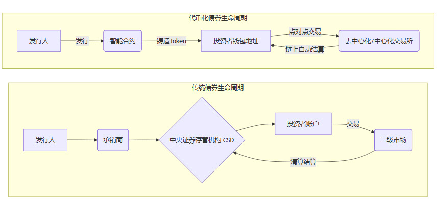我们可以通过一个流程图来对比传统债券与代币化债券的生命周期。