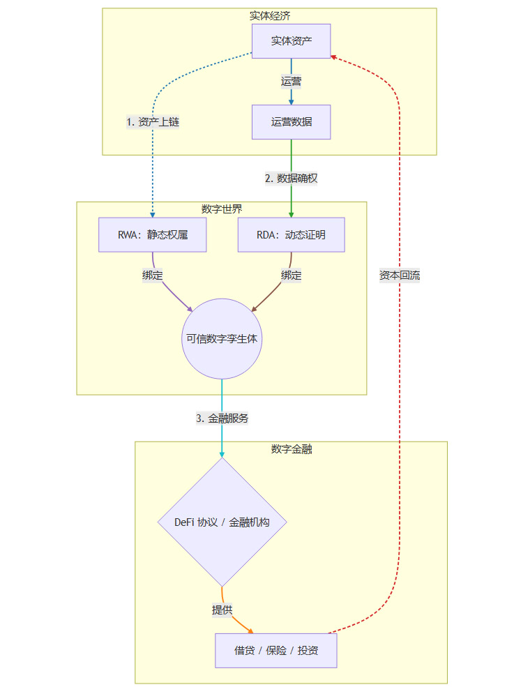 正是在这一背景下,真实数据资产(Real Data Asset, RDA)的概念应运而生。RDA并非要取代RWA,而是作为其不可或缺的伙伴。它专注于将实体资产在运营过程中产生的动态数据,转化为可信、可验证、可计价的数据资产。