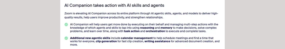 最引人注目的当属Zoom的类ChatGPT助手——AI Companion。它不仅是一个简单的AI助手,更是一个具备记忆、推理、任务执行和协调四大功能的智能体搭建平台,旨在帮助用户从重复、繁琐的工作中解脱出来,大幅提升效率。